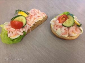 Handskalade Räkor, skivat ägg och majonnäs på ¼ hålkaka. Garnerad med gurka, tomat, citron och dill.